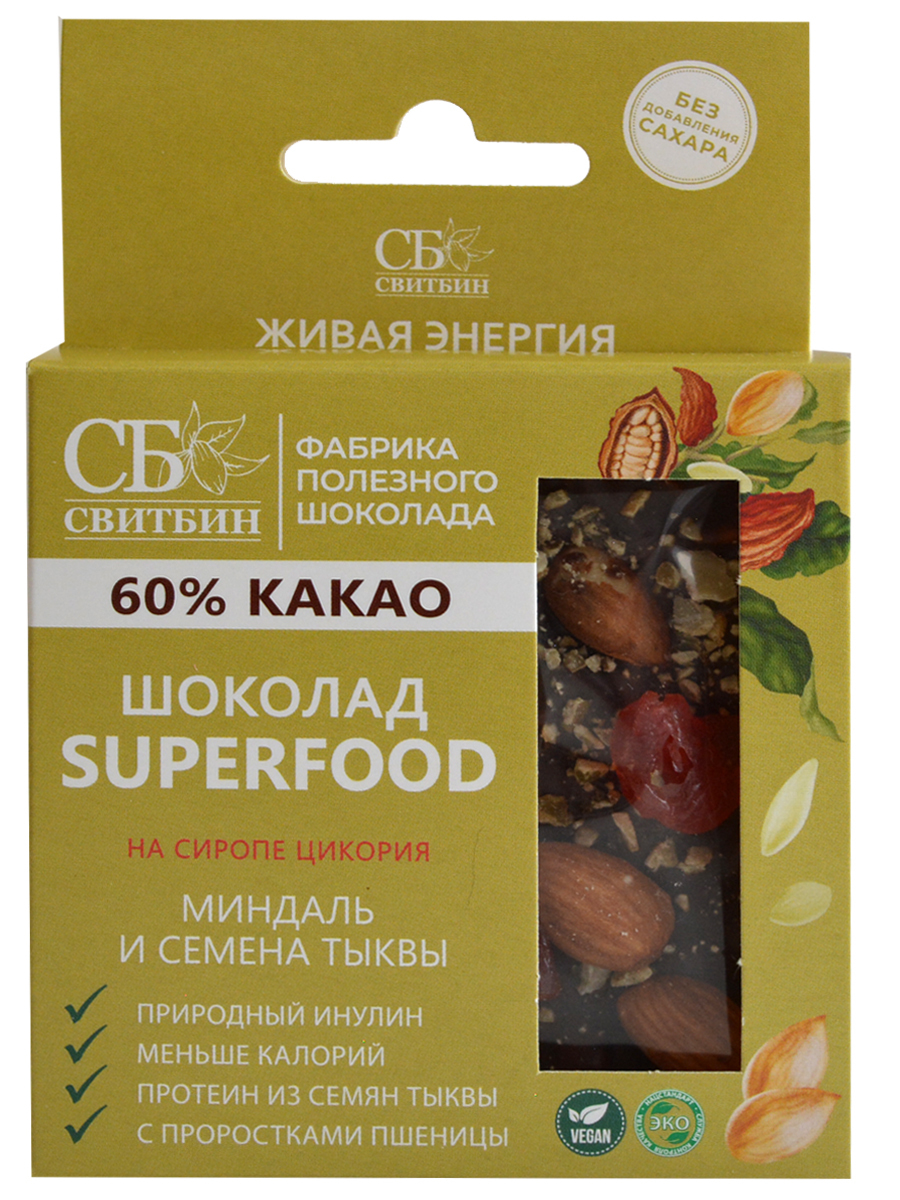 Шоколад на каждый день для активных людей! Шоколад обогащен протеином миндаля и семян тыквы! Для всех, кто ведет здоровый образ жизни! Веганский продукт! Все ингредиенты натуральные, заряжают энергией и заботятся о поддержании вашей физической формы и умственной гибкости! Шоколад - антистрессовый продукт, повышает настроение! Без сахара! Без пальмового масла! Цикорий - источник природного инулина, натуральный пребиотик, улучшает микрофлору, влияет на иммунитет, рекомендован, как общеукрепляющее средство, положительно влияющее на работоспособность, переносимость физических и умственных нагрузок. Имеет низкий гликемический индекс. Витграс - проростки пшеницы. Витграс полезен для нормального пищеварения и относится к суперфудам.