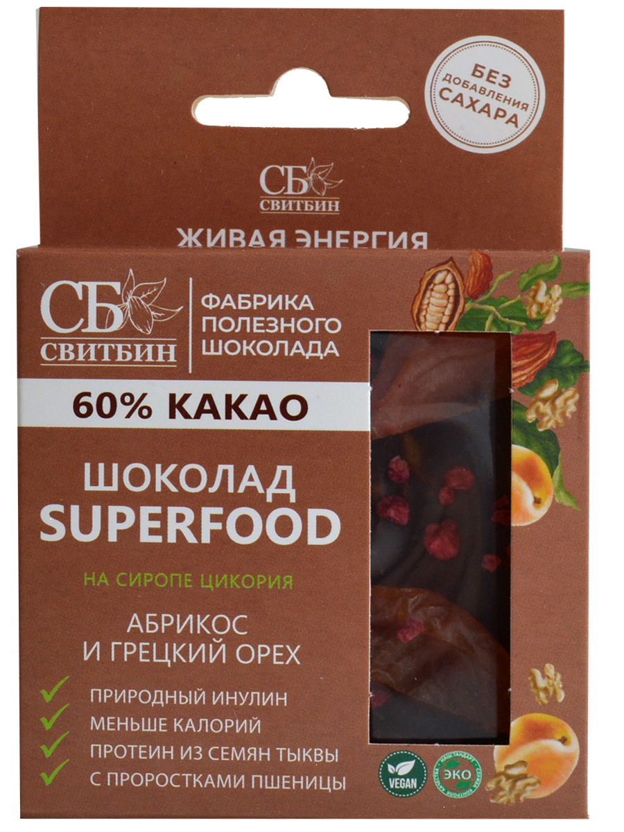 Шоколад на каждый день для активных людей! Вкуснейший абрикос приятно оттеняет вкус натурального шоколада. Для всех, кто ведет здоровый образ жизни! Веганский продукт! Все ингредиенты натуральные, заряжают энергией и заботятся о поддержании вашей физической формы и умственной гибкости! Шоколад - антистрессовый продукт, повышает настроение! Без сахара! Без пальмового масла! Цикорий - источник природного инулина, натуральный пребиотик, улучшает микрофлору, влияет на иммунитет, рекомендован, как общеукрепляющее средство, положительно влияющее на работоспособность, переносимость физических и умственных нагрузок. Имеет низкий гликемический индекс. Витграс - проростки пшеницы. Витграс полезен для нормального пищеварения и относится к суперфудам.