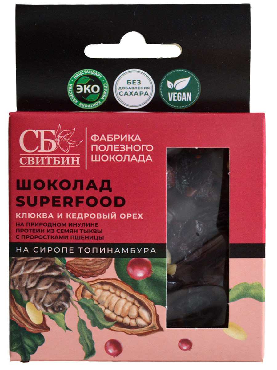 Шоколад на каждый день для активных людей! Сибирское здоровье и сила благодаря кедровым орехам и клюкве! Для всех, кто ведет здоровый образ жизни! Веганский продукт! Все ингредиенты натуральные, заряжают энергией и заботятся о поддержании вашей физической формы и умственной гибкости! Шоколад - антистрессовый продукт, повышает настроение! Без сахара! Без пальмового масла! Топинамбур - источник природного инулина, рекомендован, как общеукрепляющее средство, положительно влияющее на работоспособность, переносимость физических и умственных нагрузок. Имеет низкий гликемический индекс. Витграс - проростки пшеницы. Витграс полезен для нормального пищеварения и относится к суперфудам.