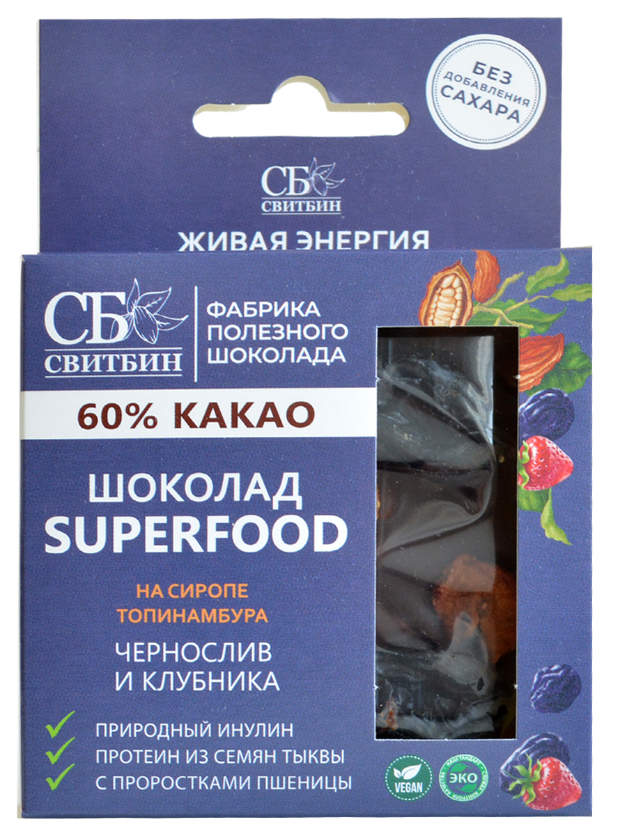 Шоколад на каждый день для активных людей! Восточные нотки - с черносливом и клубникой для настоящих любителей вкуса! Для всех, кто ведет здоровый образ жизни! Все ингредиенты натуральные, заряжают энергией и заботятся о поддержании вашей физической формы и умственной гибкости! Шоколад - антистрессовый продукт, повышает настроение! Без сахара! Без пальмового масла! Топинамбур - источник природного инулина, рекомендован, как общеукрепляющее средство, положительно влияющее на работоспособность, переносимость физических и умственных нагрузок. Имеет низкий гликемический индекс. Витграс - проростки пшеницы. Витграс полезен для нормального пищеварения и относится к суперфудам.