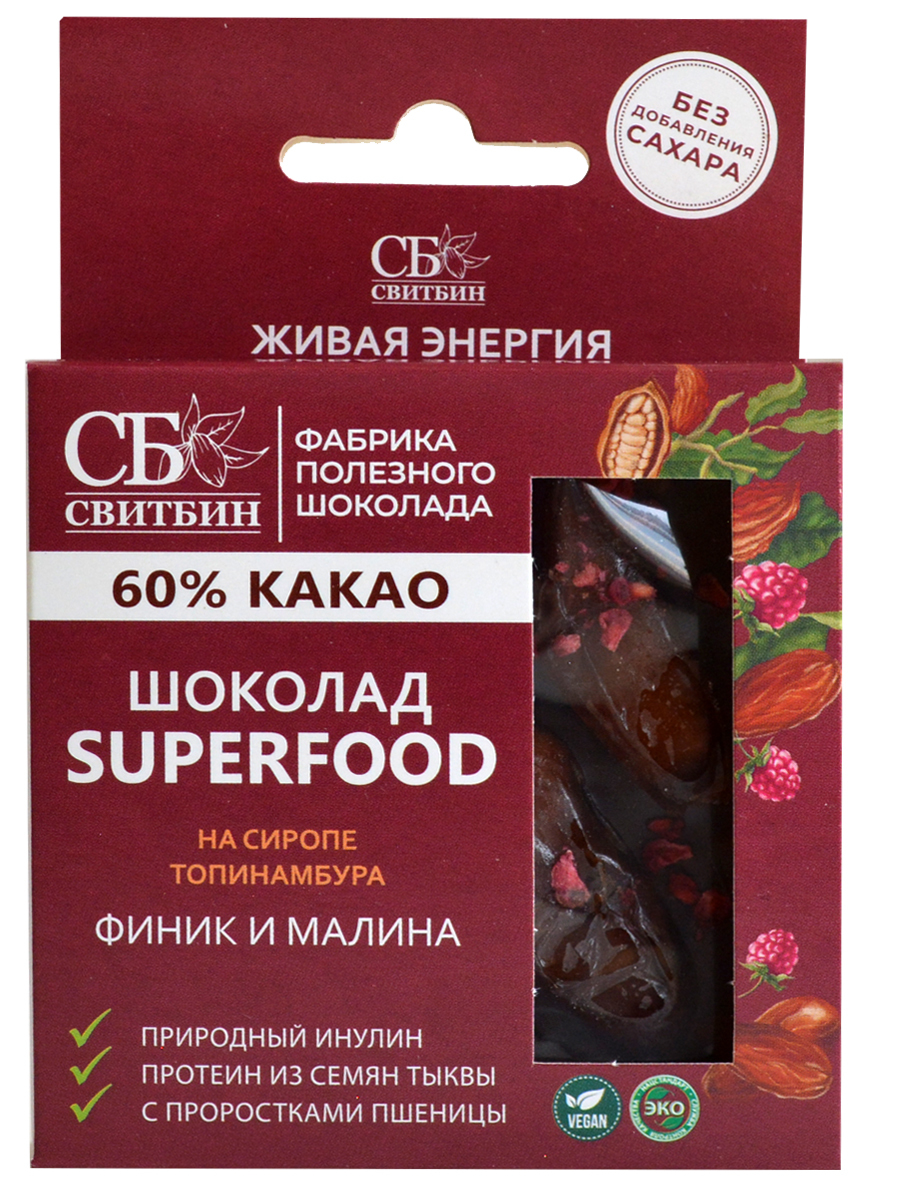 Шоколад на каждый день для активных людей! Восточные нотки вкусу придает финик в сочетании с малиной. Для всех, кто ведет здоровый образ жизни! Веганский продукт! Все ингредиенты натуральные, заряжают энергией и заботятся о поддержании вашей физической формы и умственной гибкости! Шоколад - антистрессовый продукт, повышает настроение! Без сахара! Без пальмового масла! Топинамбур - источник природного инулина, рекомендован, как общеукрепляющее средство, положительно влияющее на работоспособность, переносимость физических и умственных нагрузок. Имеет низкий гликемический индекс. Витграс - проростки пшеницы. Витграс полезен для нормального пищеварения и относится к суперфудам.