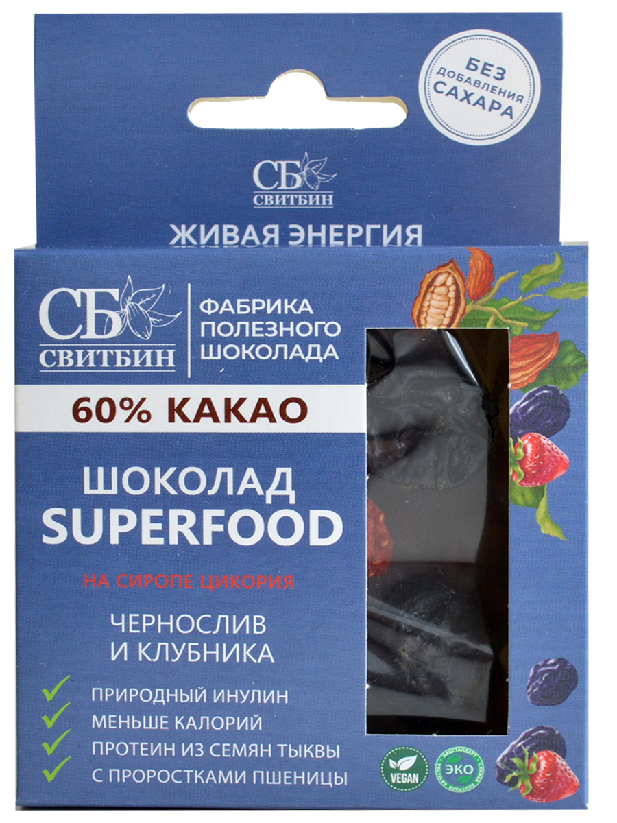 Шоколад на каждый день для активных людей! Восточные нотки - с черносливом и клубникой для настоящих любителей вкуса! Для всех, кто ведет здоровый образ жизни! Все ингредиенты натуральные, заряжают энергией и заботятся о поддержании вашей физической формы и умственной гибкости! Шоколад - антистрессовый продукт, повышает настроение! Без сахара! Без пальмового масла! Цикорий - источник природного инулина, натуральный пребиотик, улучшает микрофлору, влияет на иммунитет, рекомендован, как общеукрепляющее средство, положительно влияющее на работоспособность, переносимость физических и умственных нагрузок. Имеет низкий гликемический индекс. Витграс - проростки пшеницы. Витграс полезен для нормального пищеварения и относится к суперфудам.